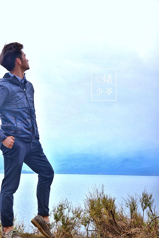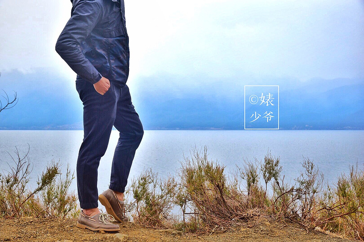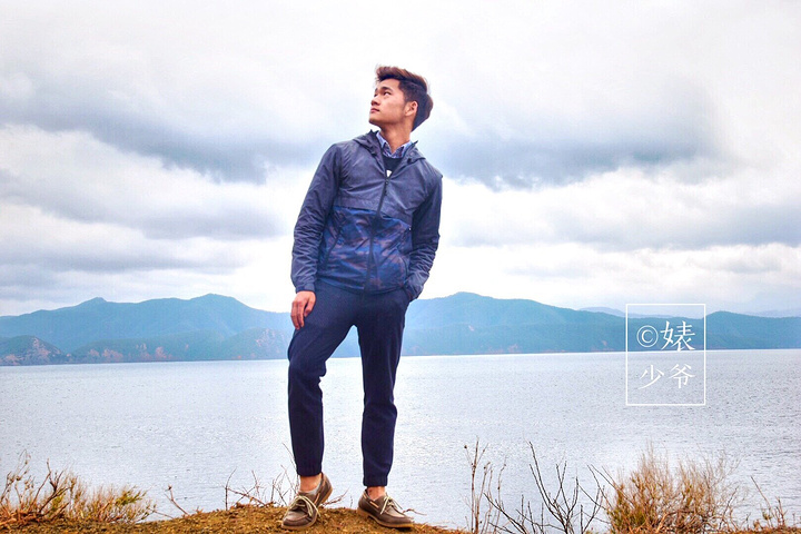 泸沽湖。湖边一处高地,飘扬着藏族独特的彩旗