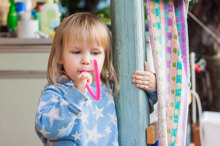 孩子坐在童车和甜甜地微笑
