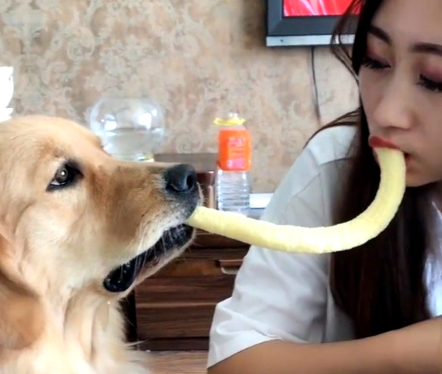 女主独吃零食,金毛气愤一口抢过:让你只顾玩手