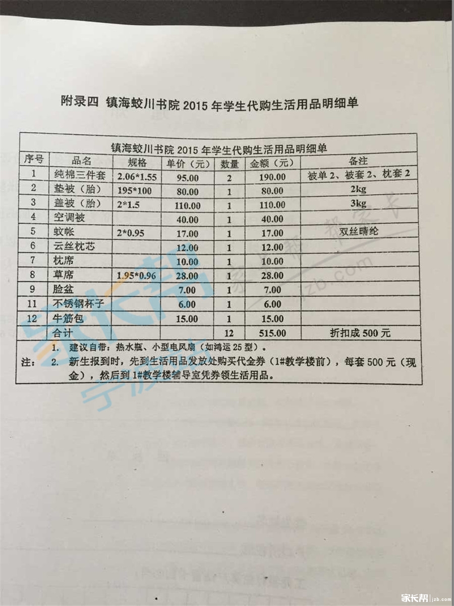 蛟川书院2015级新初一暑假作业、告家长书、生活用品清单等