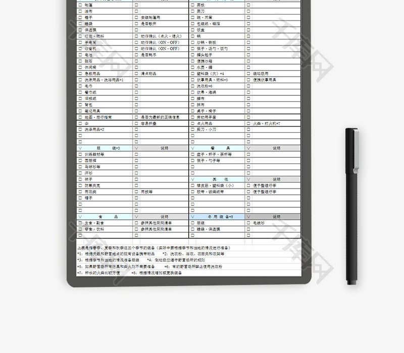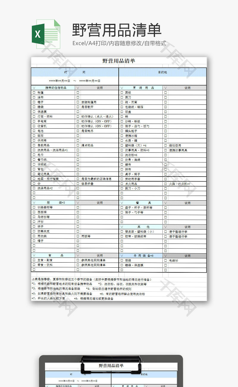 生活休闲野营用品清单Excel模板