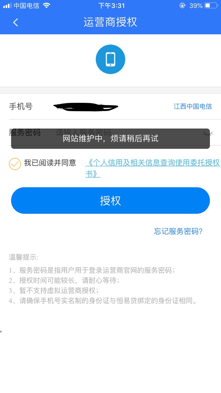 恒易贷老哥们,为什么手机运营商授权不了,一直
