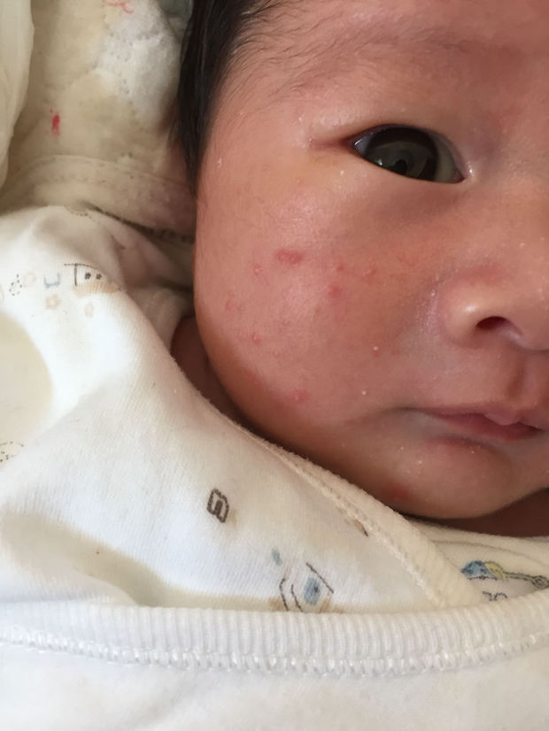 宝宝出生一周,脸上泛红,起一大片带白点点的痘