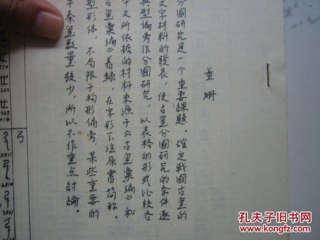 油印本:战国古玺文字分国偏旁表谱, 8开6页