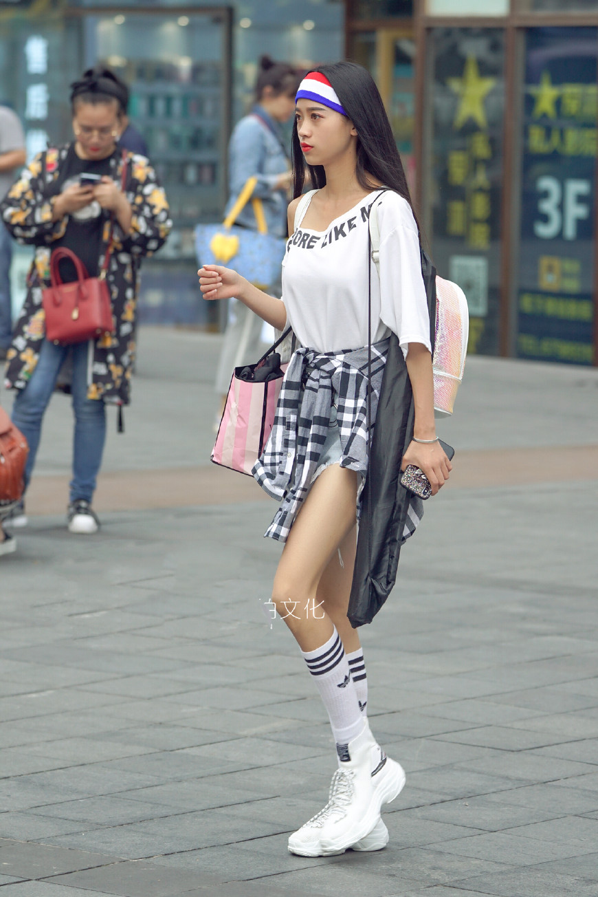街拍:牛仔短裤+白色长筒袜,美女这样搭配时尚又减龄