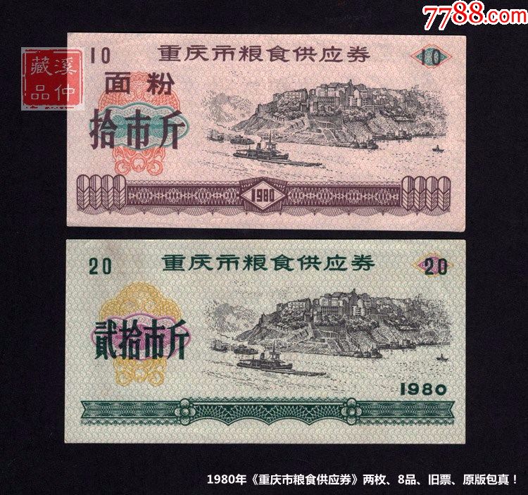 1980年《重庆市粮食供应券》、两枚、拾斤和