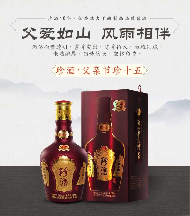【珍酒官方旗舰店】贵州珍酒 53度酱香型白酒500ml单瓶礼盒装 父亲节纪念版珍十五 粮食坤沙白酒