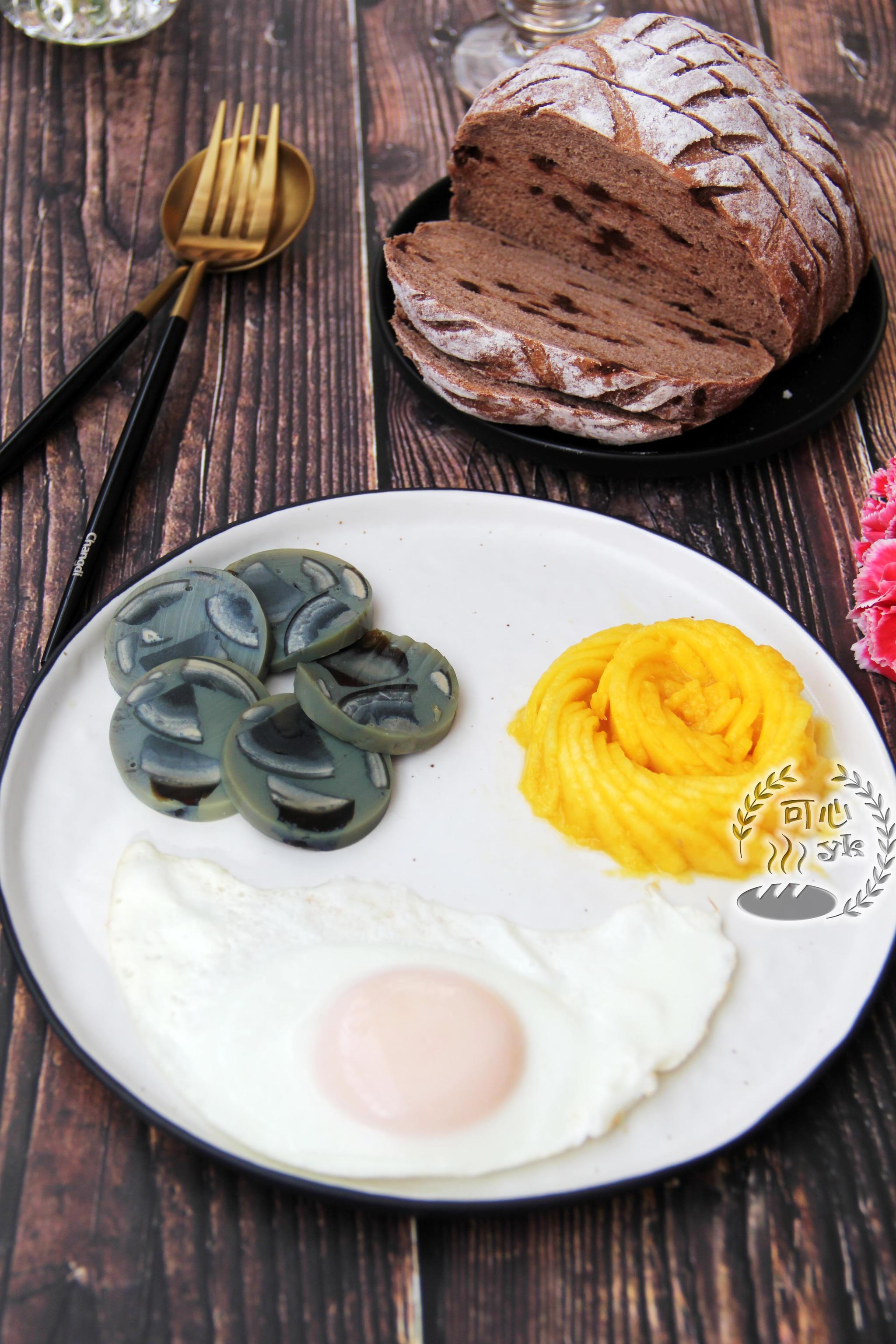 全麦香蕉可可软欧、芒果、皮蛋肠、煎鸡蛋、百香果蜂蜜饮。