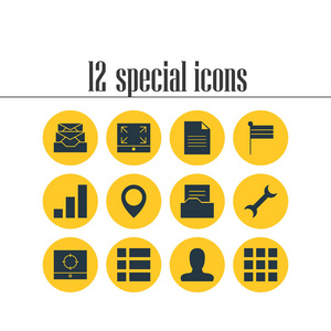 矢量图的 12 工具图标。可编辑包信、 教科书、