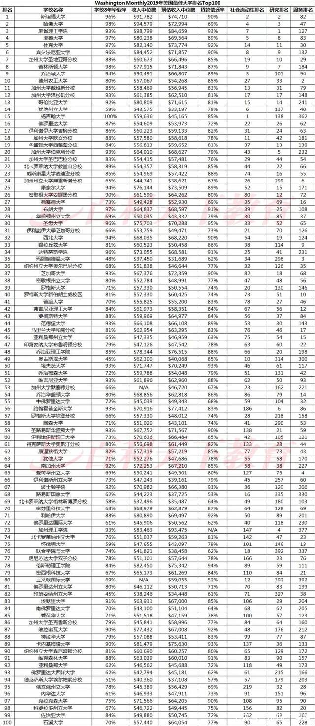 5) 2019的美国大学综合排名(前100所) 《美国新闻与世界报道》(US News and World Report))发布了2019的美国大学综合排名(National University Rank),《美国新闻与世界报道