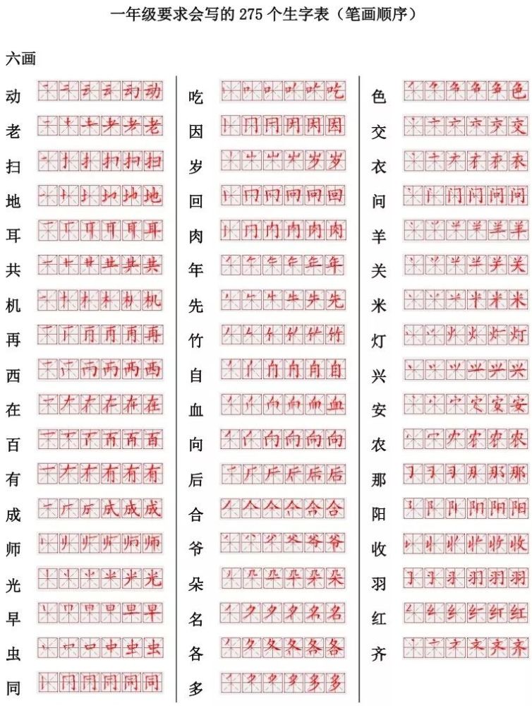 小学语文一年级275个生字笔顺表!田字格、字顺