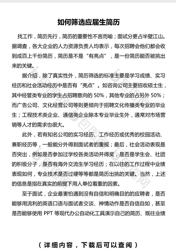 一、查看简历的基本信息。1、硬性条件:根据公司对该岗位的任职资格(性别、年龄、学历、业绩、相关工作经历等方面),筛选简历前应明确哪些条件是必须的,在10秒钟之类即可做出判断,对不符合硬性条件的迅速PASS掉。2、软性条件:每个年龄阶段人的思想都不同。一般而言,假设22岁踏入社会,22-25岁处于发展