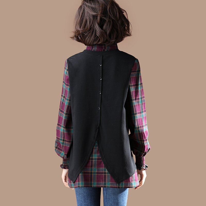 相思鸟 衬衫领针织格假两件上衣 - 聚美