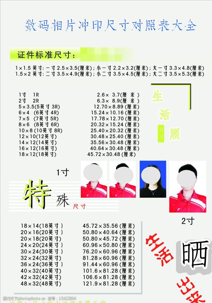 [最佳答案] 照片 2113 的尺 寸是 以英寸为单 位, 1英寸=2.54cm 1寸 2.5*3.5cm (身份证大头照 5261 3.3*2.2 ) 2寸 3.5*5.3cm 小 4102 2寸( 护照 ) 4.8*3.3cm 5 寸 5x3.5 12.7*8.9 6 寸 6x4 15.2*10.2 7 寸 7x5 17.8*12.7 8 寸 8x6 20.3*15.2 10寸 10x8 25.4*20.3 12寸 12x10 30.5*20.3 15寸 15x10 38.1*25.4 扩展