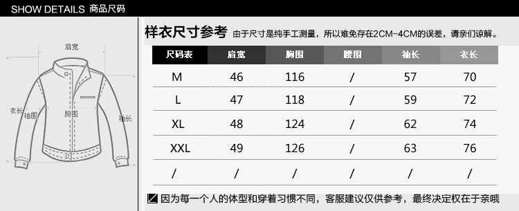 成品女装外套尺码表 女装外套尺码表 美标型号 身高/腰围(厘米) 胸围(厘米) 腰围(厘米) 肩宽(厘米) 袖长(厘米) XS 150/76 89/96 71/79 38.5-41 57-58.5 S 155/80 93/100 75/83 39.5-41.5 58-59.5 M 160/84 97/104 79/87 40.5-42 59-60.5 L 165/88 101/108 83/91 41.5-42.5 60-61.5 女装衬衫尺码表美标型号 身高/腰围(厘米) 胸围(厘米) 肩宽(厘米) 袖长(厘米