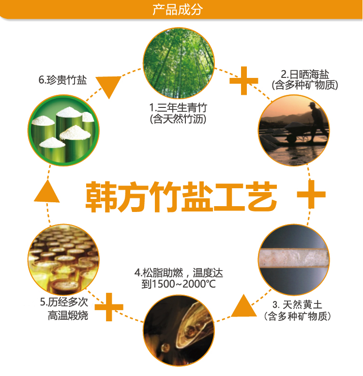 简介:竹盐,是将日晒盐装入三年生的楠竹中,两端以天然黄土封口,以松树为燃料,经1000℃~1300℃高温煅烧后提炼