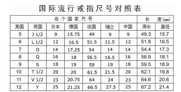 [最佳答案] 戒指尺寸对照表 号数(港码) 直径(mm) 周长(mm) 7-14.5-46 8-15.1-47.5 9-15.3-48 10-16.1-50.5 11-16.6-52 12-16.9-