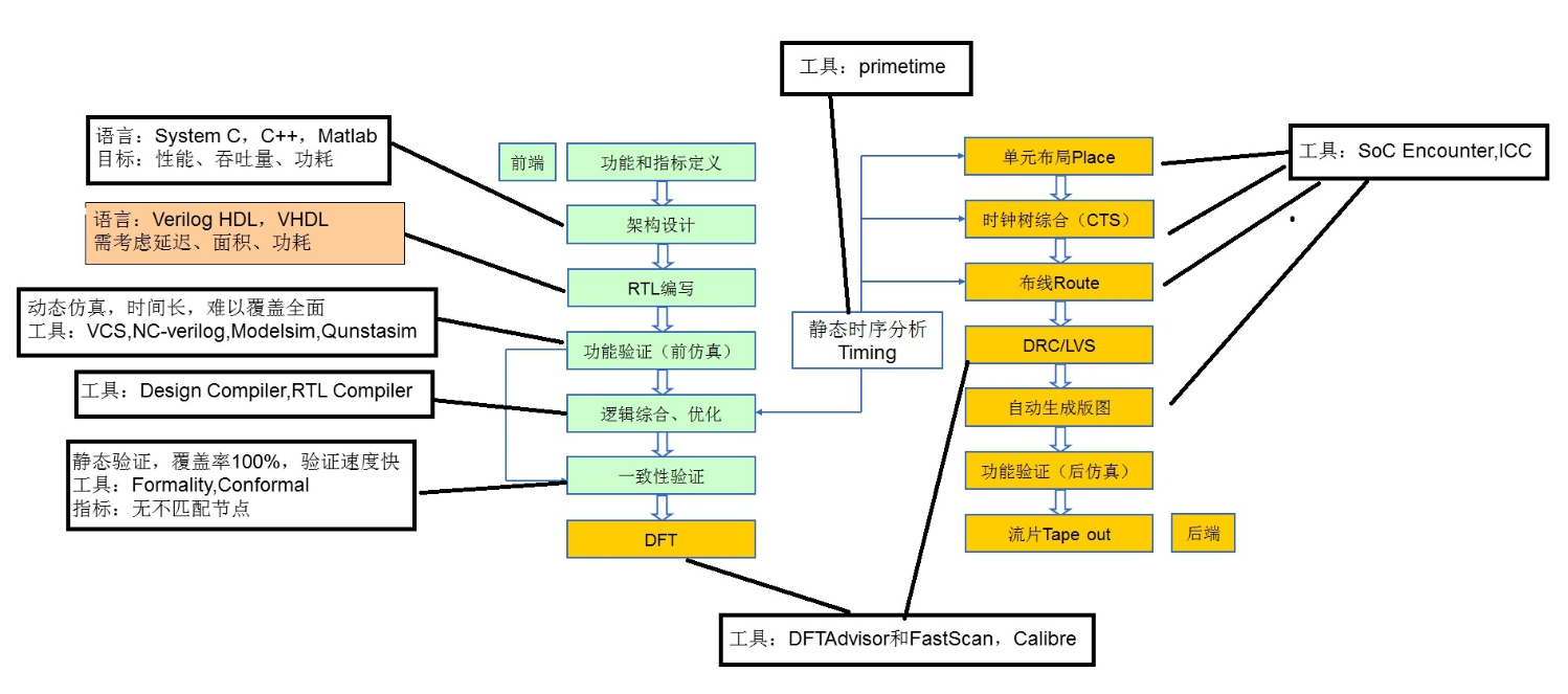 [最佳答案] 对于数字集成电路设计,一般分为数字前端与数字后端两部分。我将分别介绍这两部分的设计流程。水平有限,如有错误之处希望大家指正。-前端设计总流程1.算法或硬件架构设计与分析目的:完成芯片中数字部分的高层次算法或架构的分析与建模,为硬件提供一个正确的软件功能模型,更为重要的是,通过大量的高层次仿真和调试,为RTL实现提供总体性的设计指导。数字部分越复杂,这一点越重要。工具:MATLAB、C++、C、System C、System Verilog等。不同类型的芯片都不同的选择,如数字信号处理类芯片,偏好MATLAB。特点:这部分工作至关重要,基本上奠定了整个芯片的性能和功耗的基础。这部分工作主要由具有通信、信号处理、计算机、软件专业背景的工程师完成,也有很多微电子专业背景的工程师参与。2. RTL实现目的:依据第一步的结果,完成由高层次描述到Verilog HDL实现的过程。工具:Vim、Emac(二
